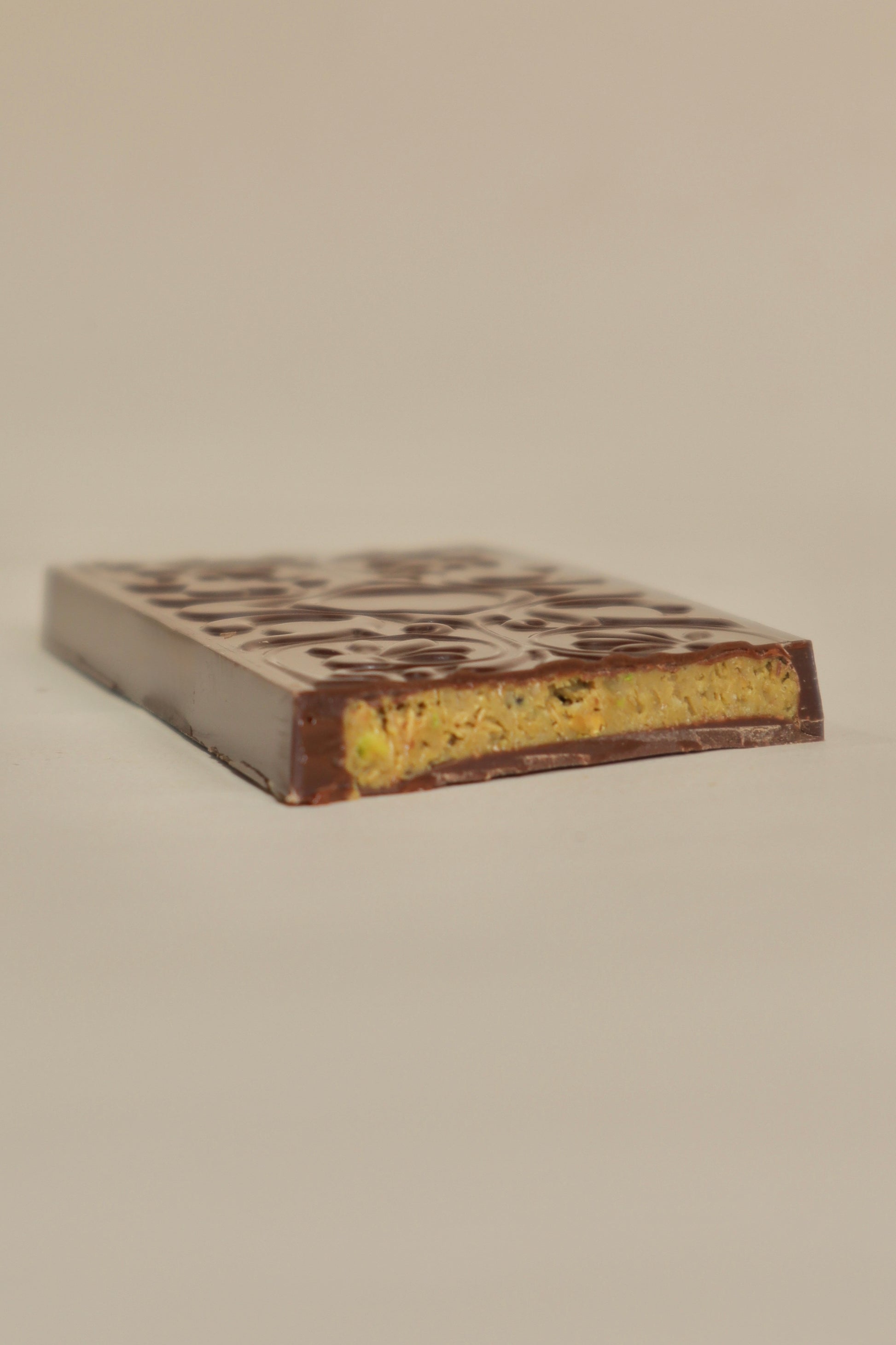 This Middle Eastern-inspired delight features a stoneground dark chocolate shell made from Single Origin Malaccan Cacao. Inside, a rich blend of house-made Pistachio Praline, crispy baked Kunafa, pure tahini and a gentle hint of extra virgin olive oil, creates a crunchy and flavourful experience that invites your taste buds to savour every bite.